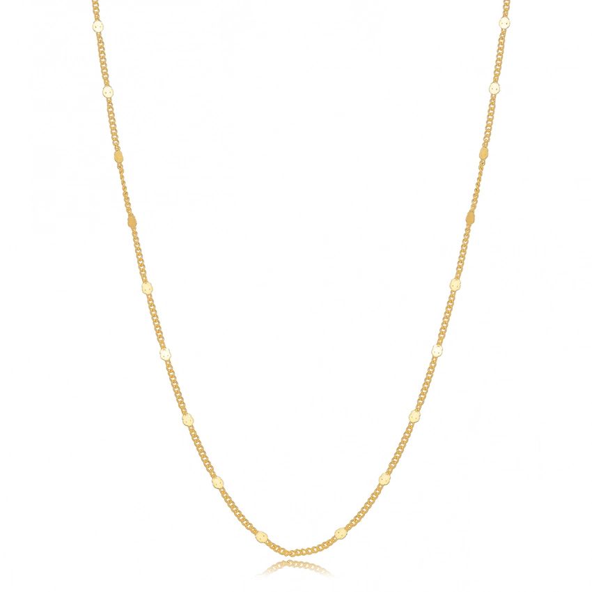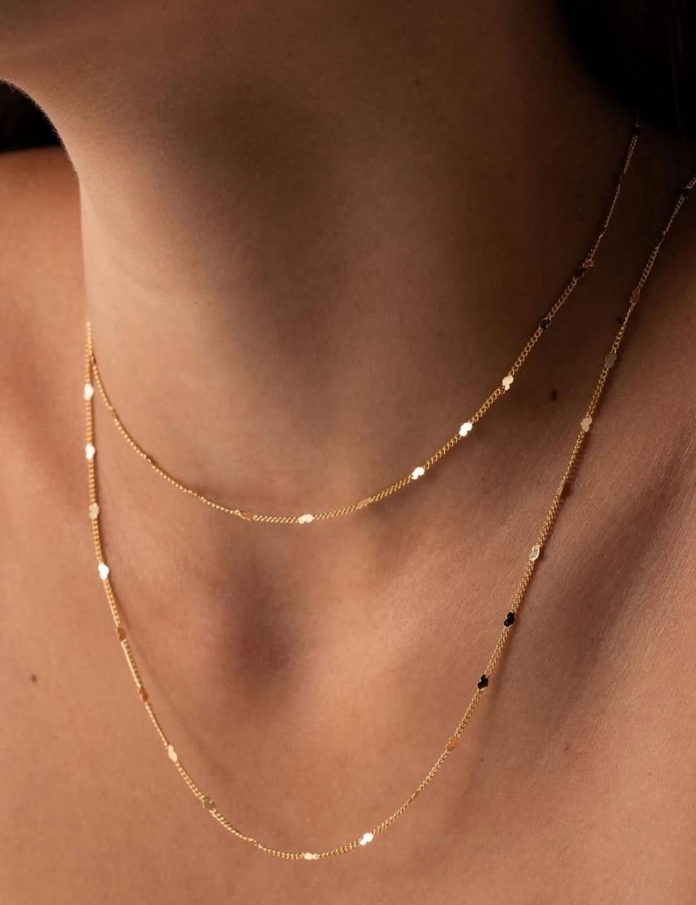 Colar de Chapinhas em banho de Ouro 18k: minimalista e elegante, este colar traz pequenas chapinhas distribuídas ao longo da corrente, criando um brilho sutil e sofisticado. Leve e versátil, é perfeito para valorizar o decote em looks do dia a dia ou complementar produções mais refinadas.